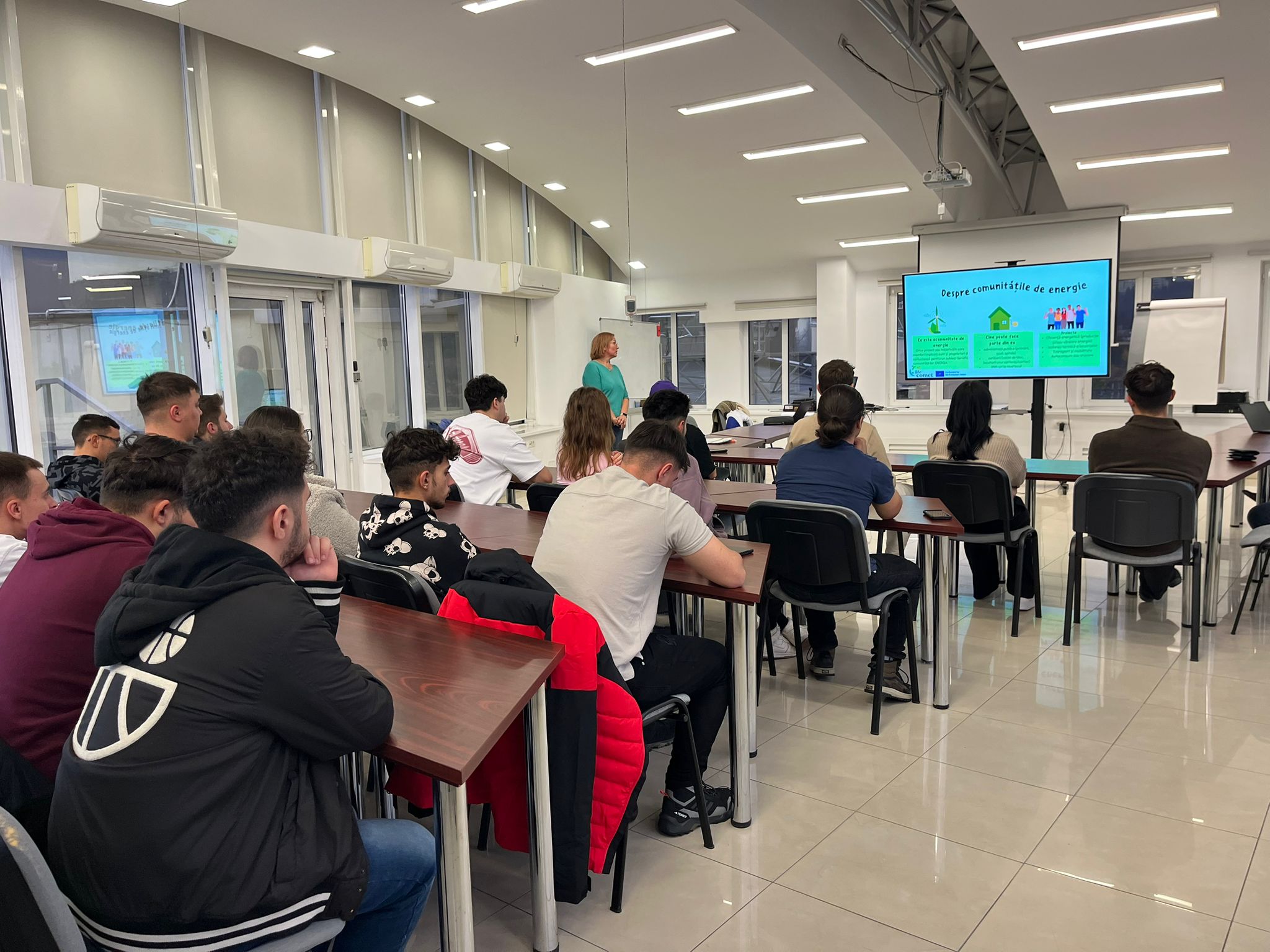 Un element-cheie în acest context de conștientizare este rețeaua de Ambasadori ai Comunităților Energetice, oameni care cred în acest concept și îl traduc în limbaj accesibil pentru diverse grupuri-țintă: autorități, ONG-uri, asociații de proprietari, tineri. Unul dintre acești ambasadori, Camelia Sava, de la Cooperativa de Energie, a fost alături de echipa OER în cadrul sesiunii de lucru cu studenții. Pe lângă curiozitățile legate de modul în care cetățenii pot prelua controlul asupra energiei, întâlnirea a adus în discuție și o perspectivă practică asupra subiectului Comunităților Energetice. S-a vorbit despre cum se constituie, în realitate, o comunitate care își produce și își gestionează parțial energia. Au fost prezentate și modele de implicare a cetățenilor deja existente la nivelul UE: Partago (Belgia), Repowering London, Ecopower (Belgia), precum și tipurile de finanțări care pot fi accesate. De asemenea, au fost discutați și primii pași necesari pentru demararea unor astfel de inițiative.